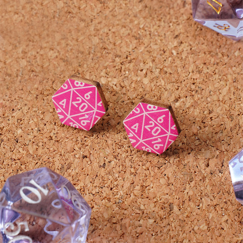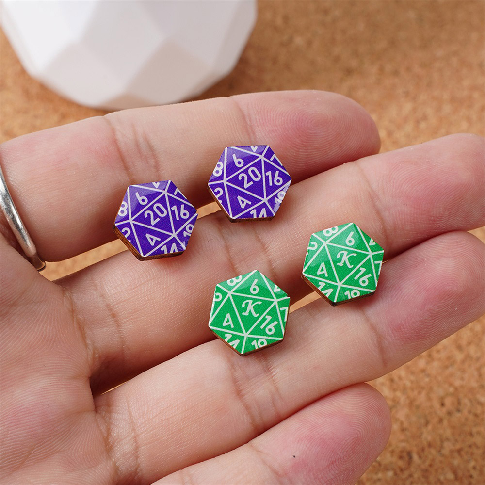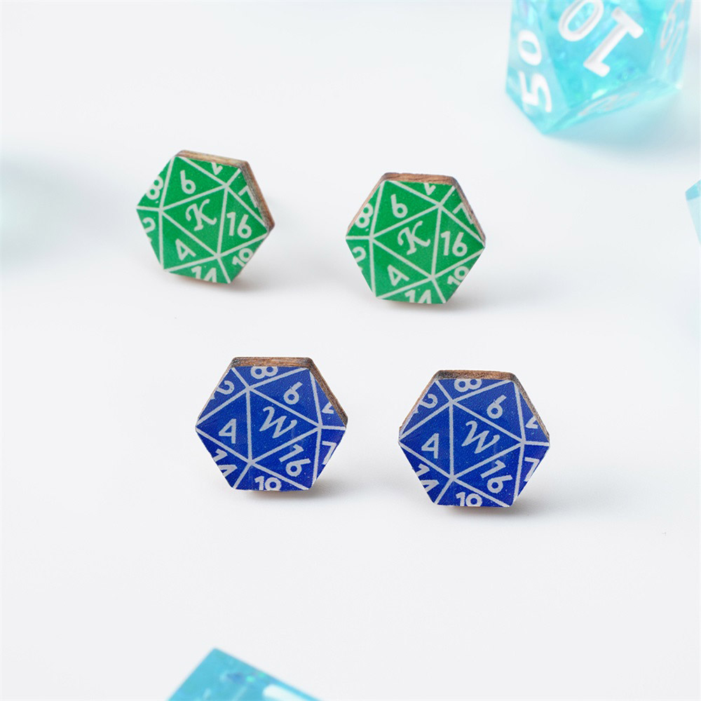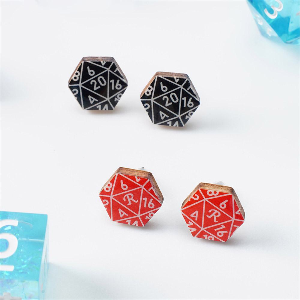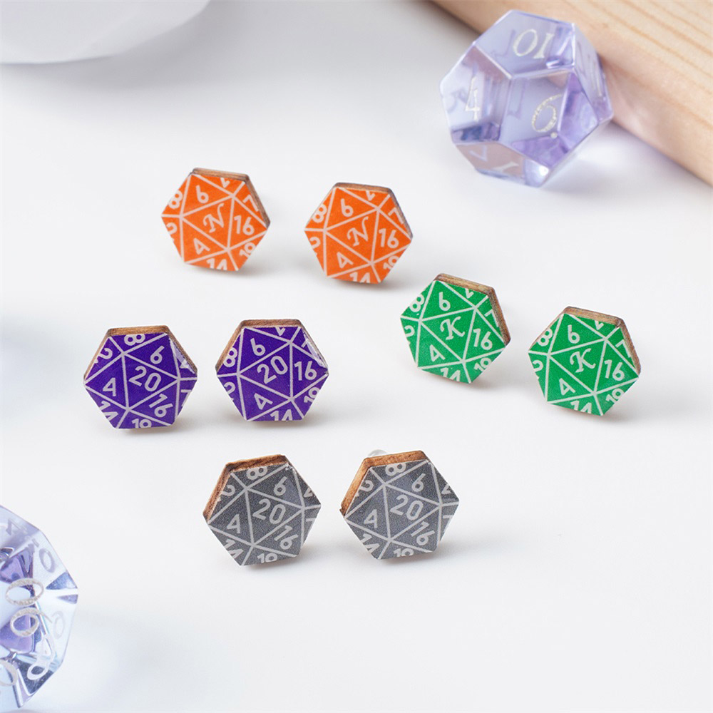 Ultra lightweight wood earrings! Each earring weighs only 0.3g. Inspired by the classic multi-faceted dice, the exquisite design and colors make it a highlight of any gaming session.
