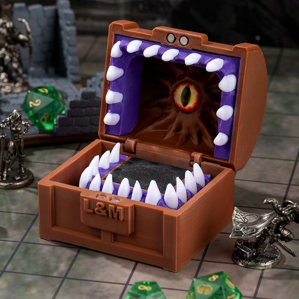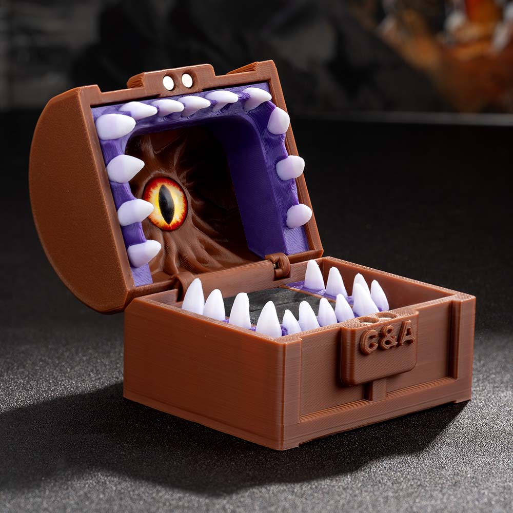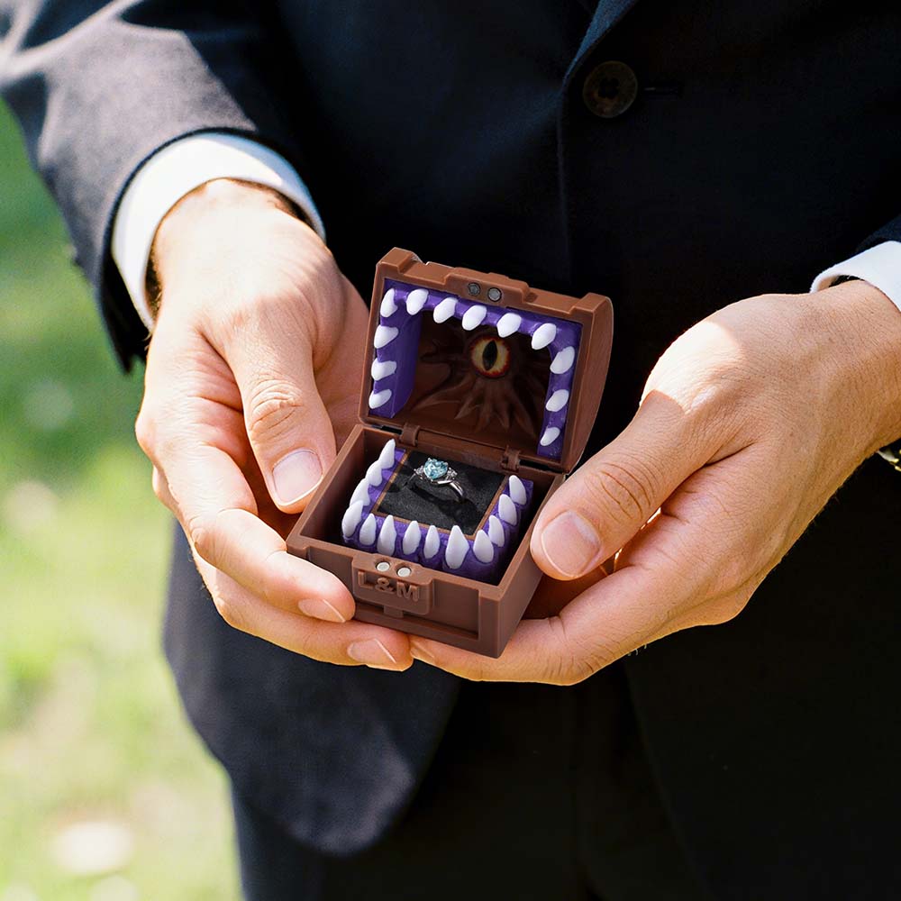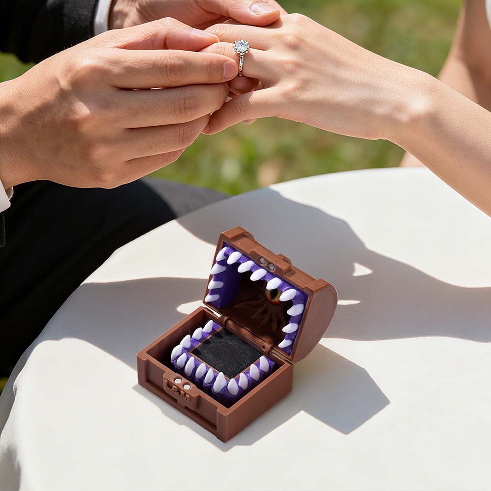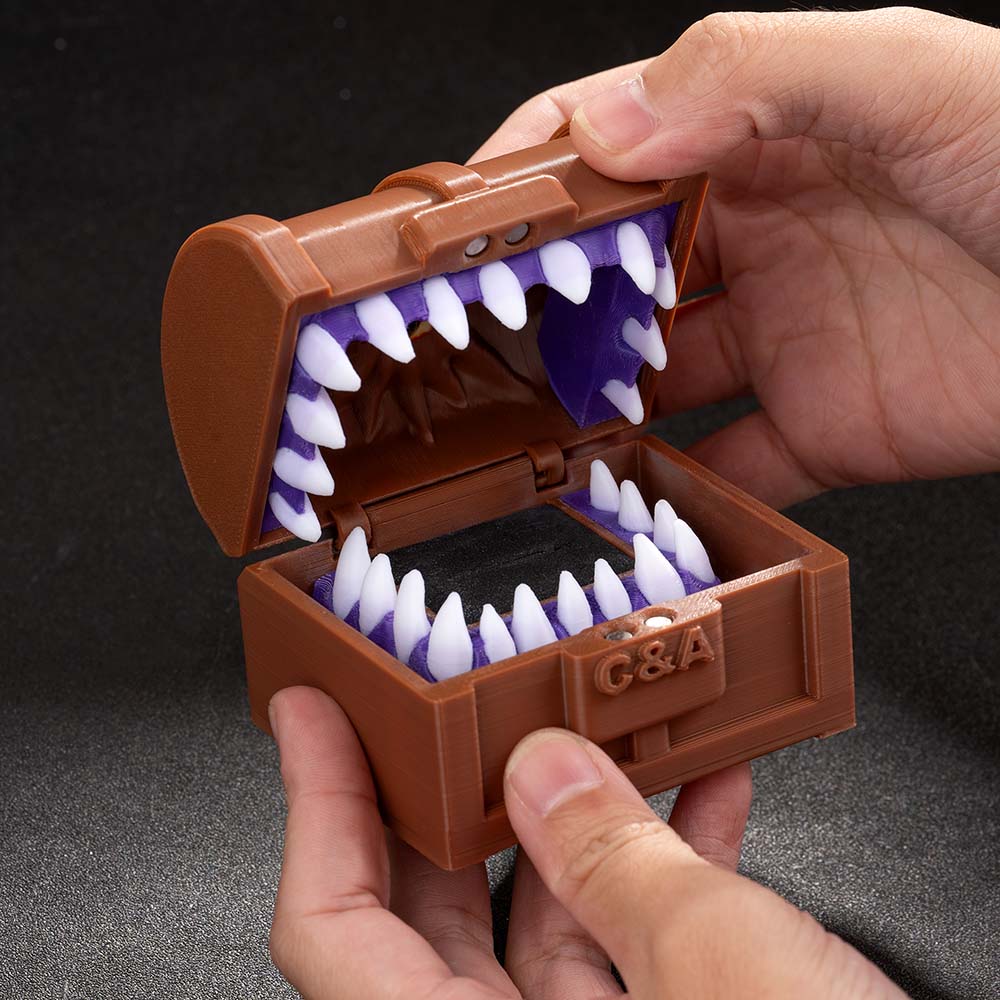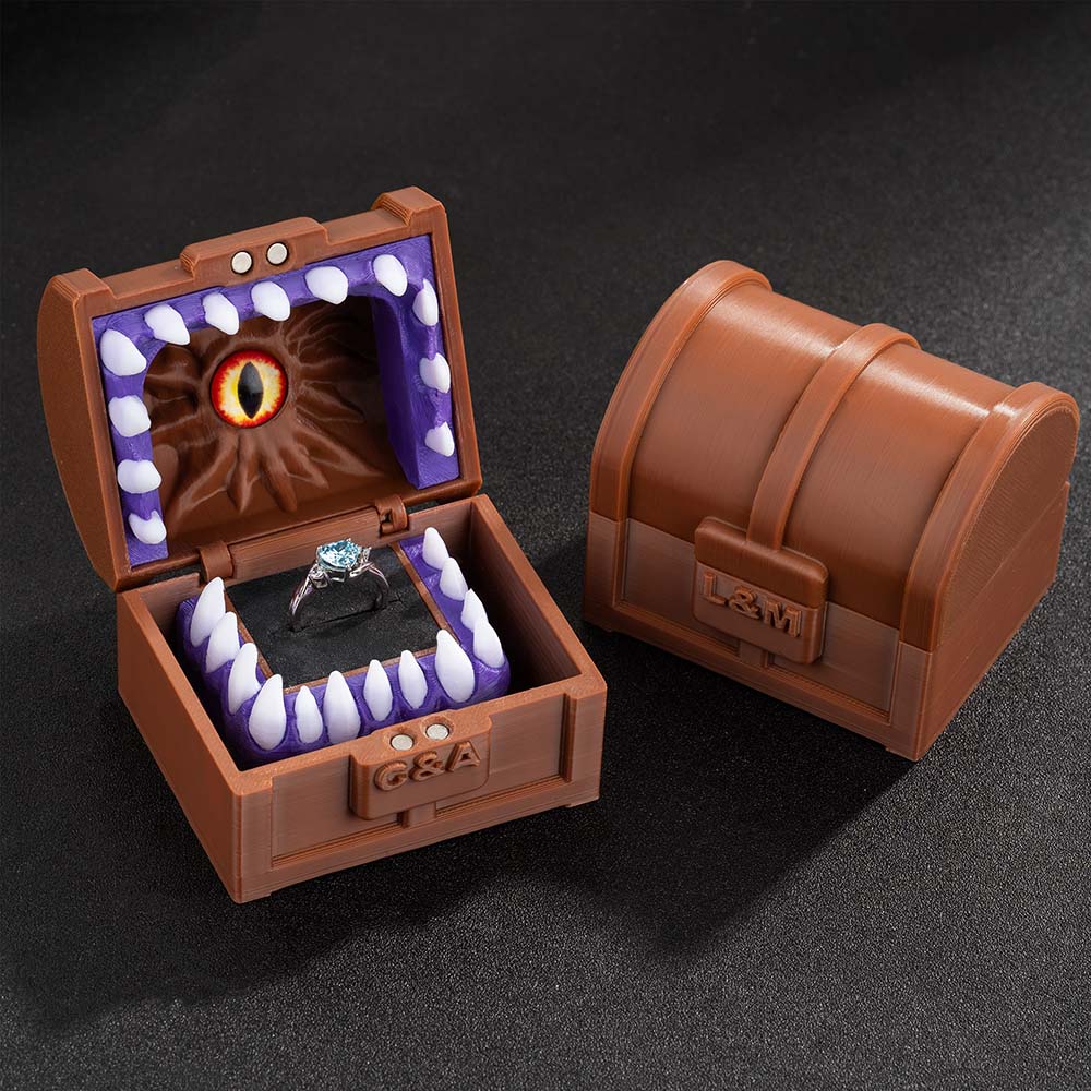 Explore this unique Mimic shaped ring box, which is the perfect companion for marriage proposals and engagement occasions. The inspiration comes from the classic DND imitation monster, which not only has a unique design, but also integrates profound meaning and fun. Made of environmentally friendly PLA material, it is both lightweight and sturdy, ensuring the safe storage of the ring.