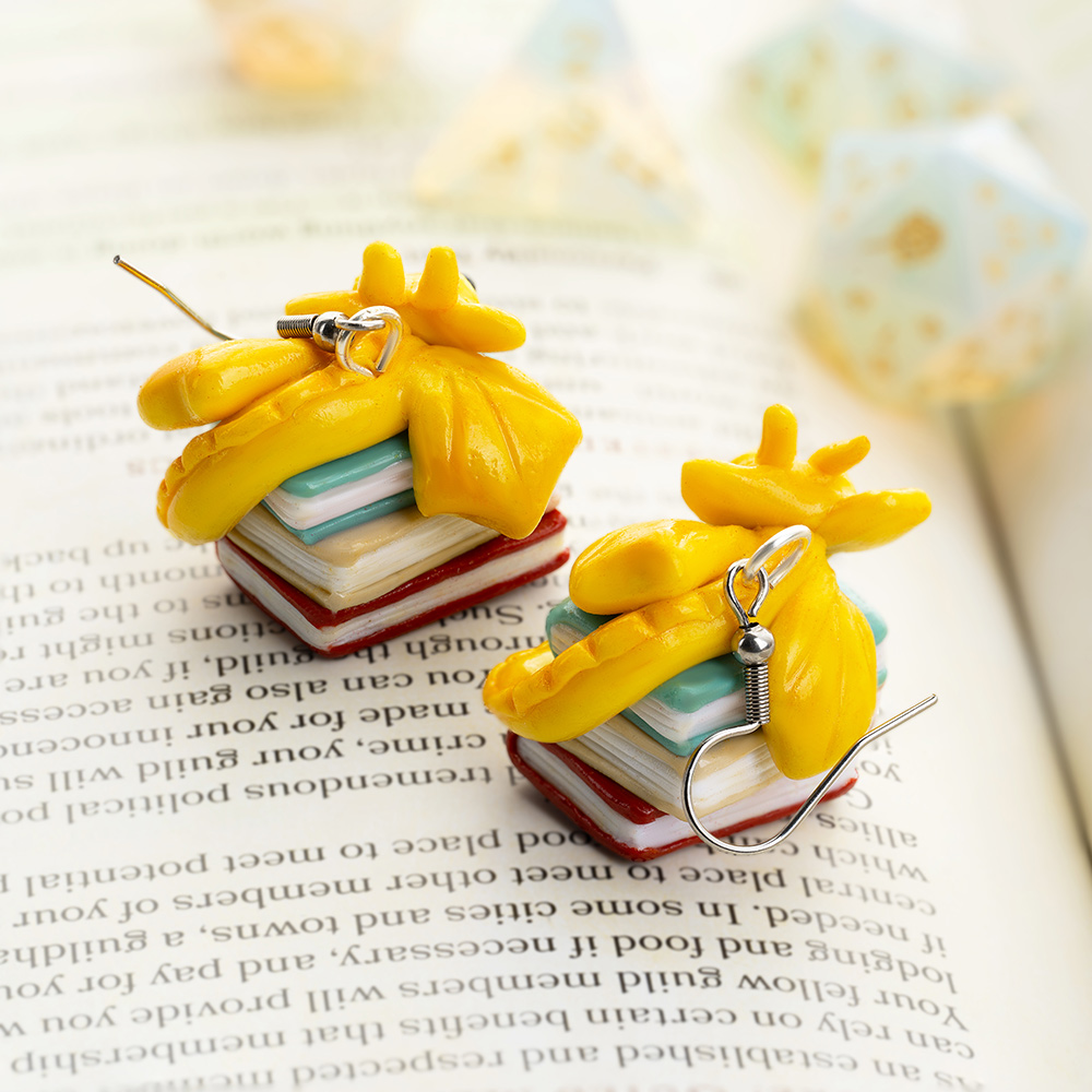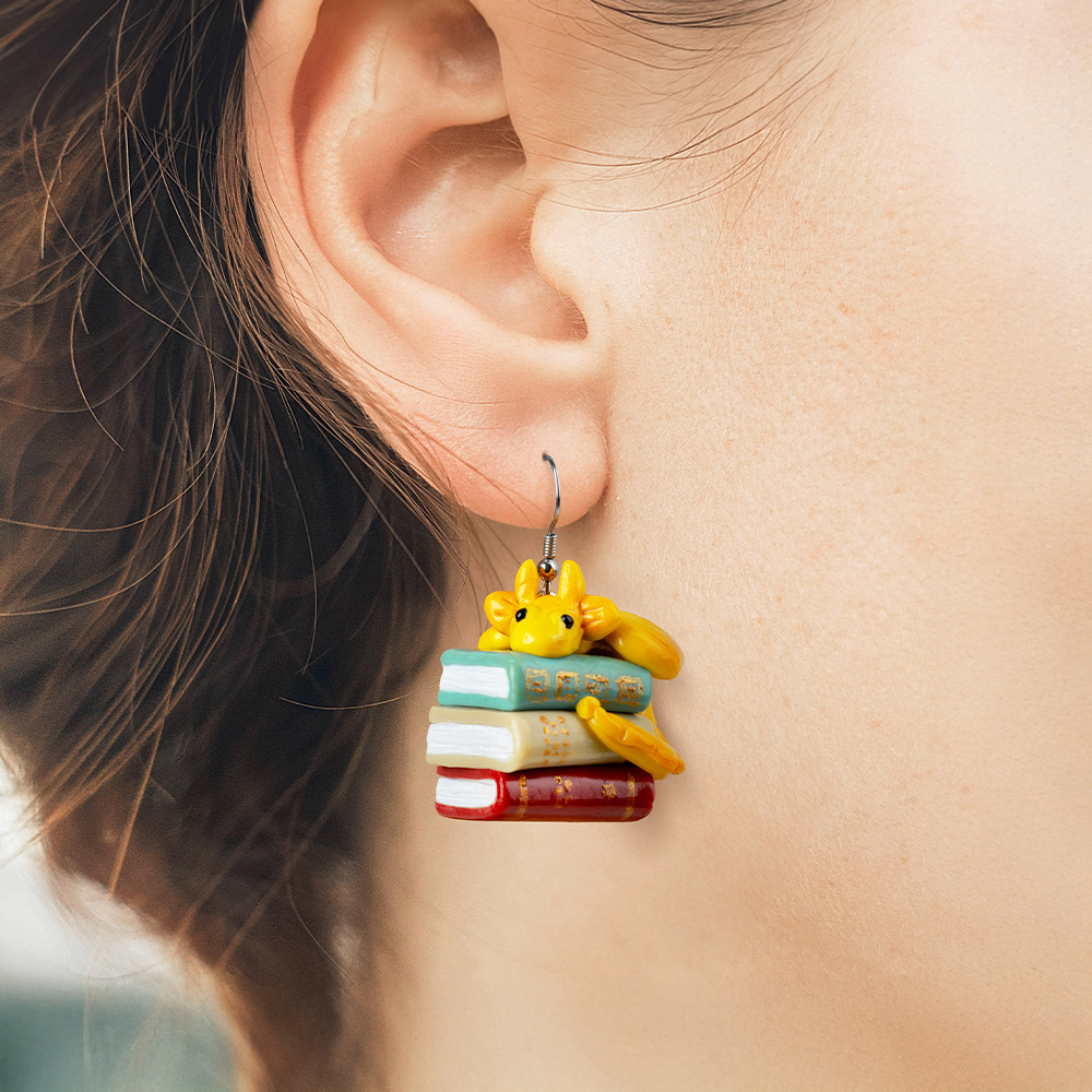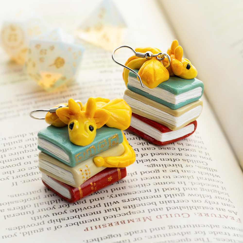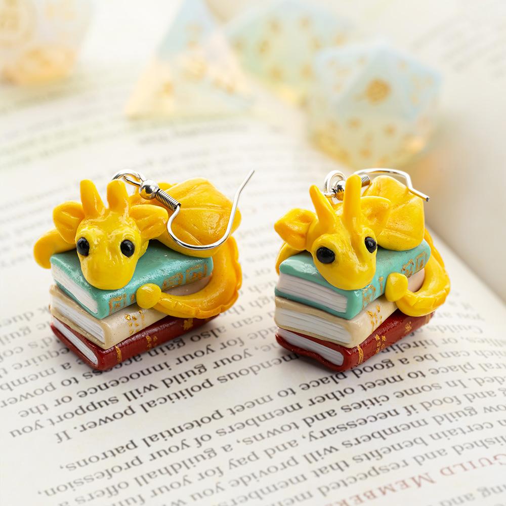 These charming earrings are handmade from polymer clay, and their uniqueness lies in the fact that each pair does not use molds, showcasing the artist's exquisite skills. The small dragon perched on the earring sits on the pile of books, with bright colors and lifelike details presented through hand drawn techniques.