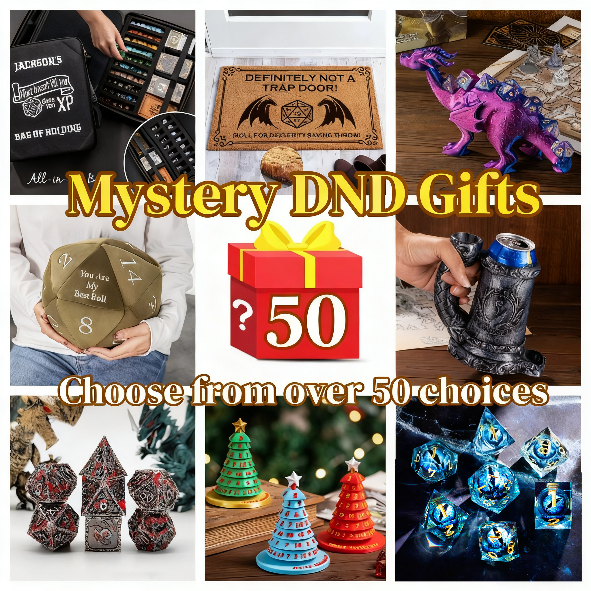 The products in the picture are just a few of them. The mystery box is randomly selected from 50+ products, including dice sets, dice display stands, dice bags, throw pillows, Christmas ornaments and more!