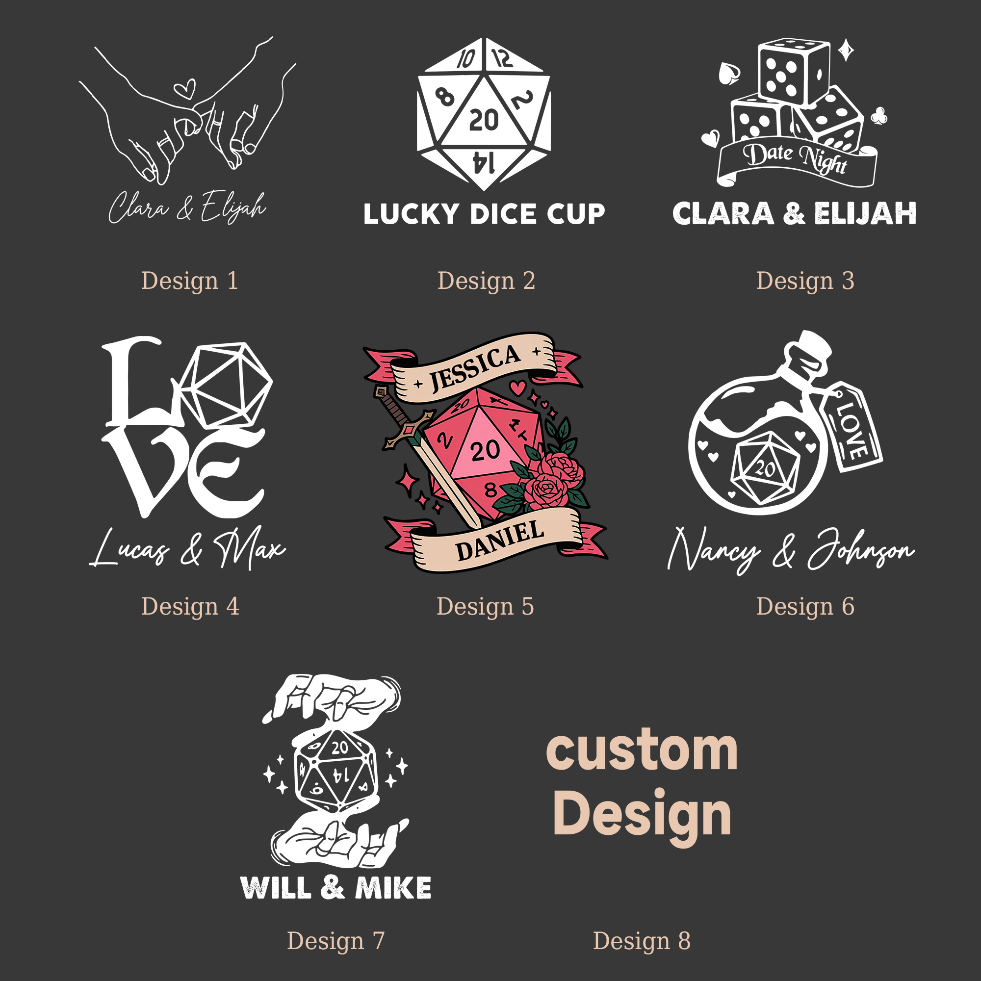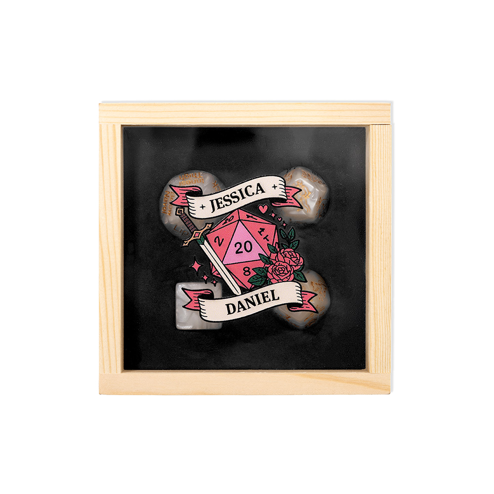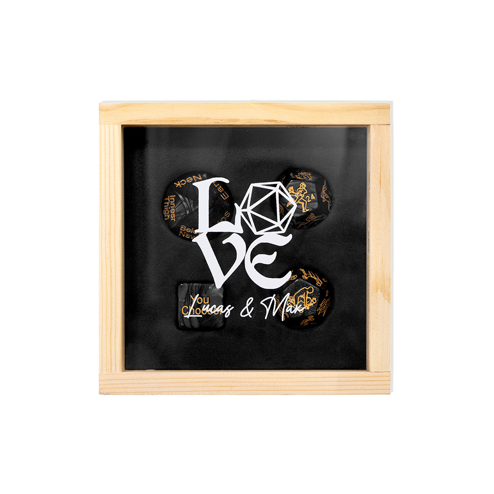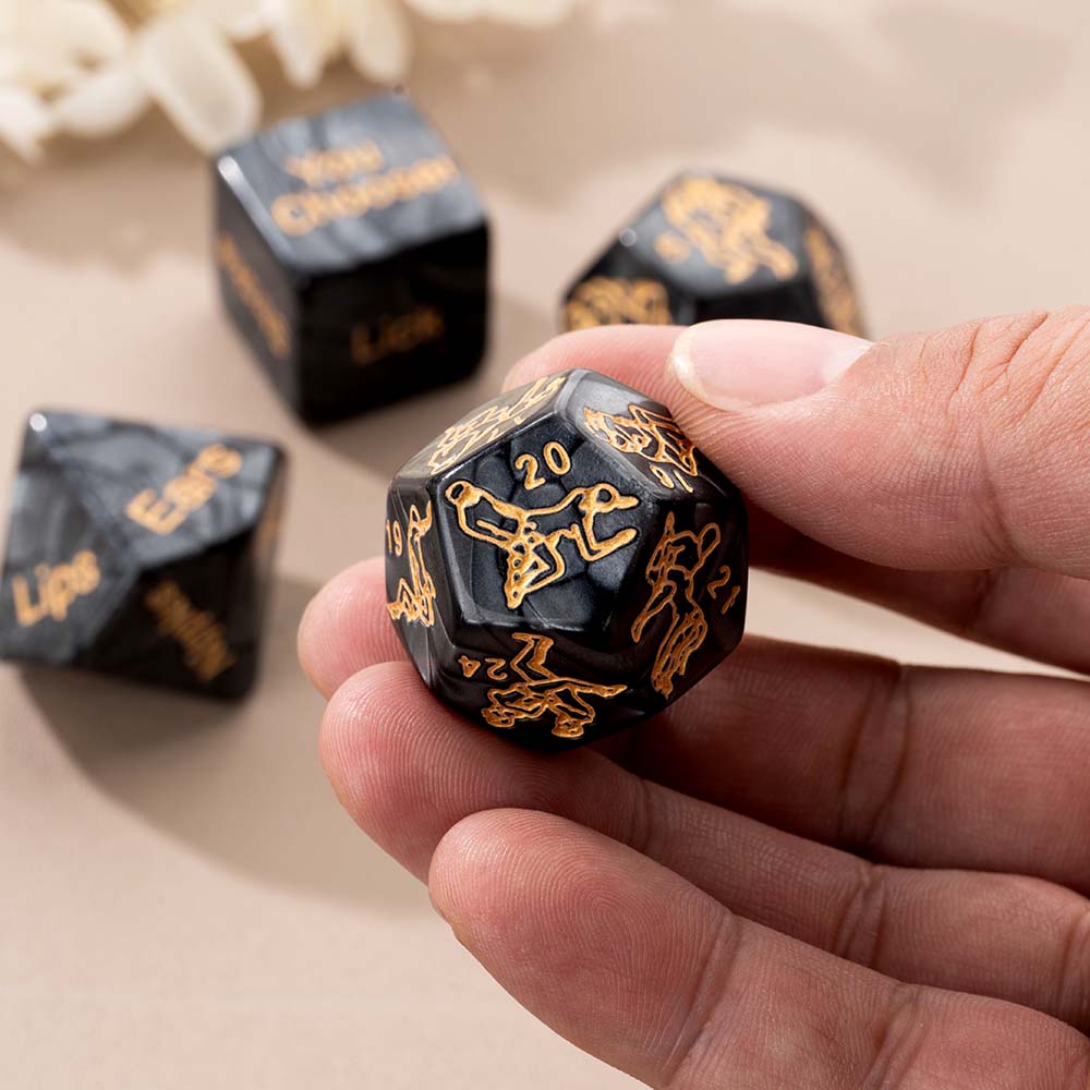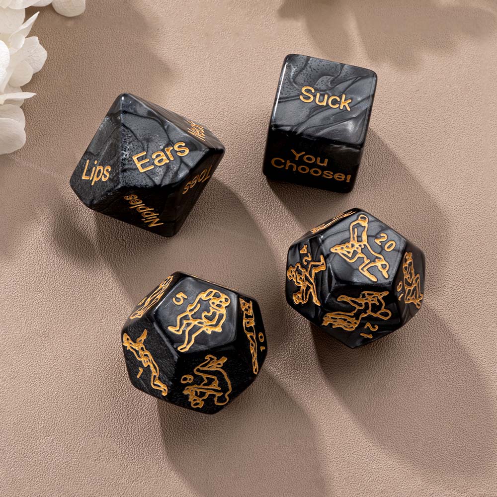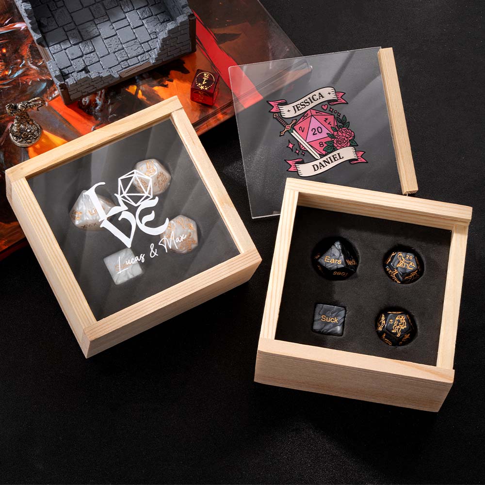 This customized love dice set includes 4 carefully carved dice, one D10 is used for random parts, one D6 is used for random actions (such as kissing toes), and the two D12s are printed with selected adult guided actions and fun tips on each side, aiming to provide a relaxed, fun, and creative interactive way for intimate moments between couples. High quality resin material and clear and wear-resistant engraving ensure long-term use. The solid wood transparent cover display box and black inner lining groove not only facilitate storage and carrying, but also elegantly display your exclusive customization (can engrave names or patterns), making every dice roll a small ceremony to reignite passion.