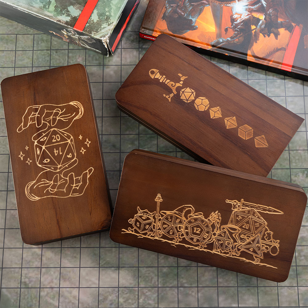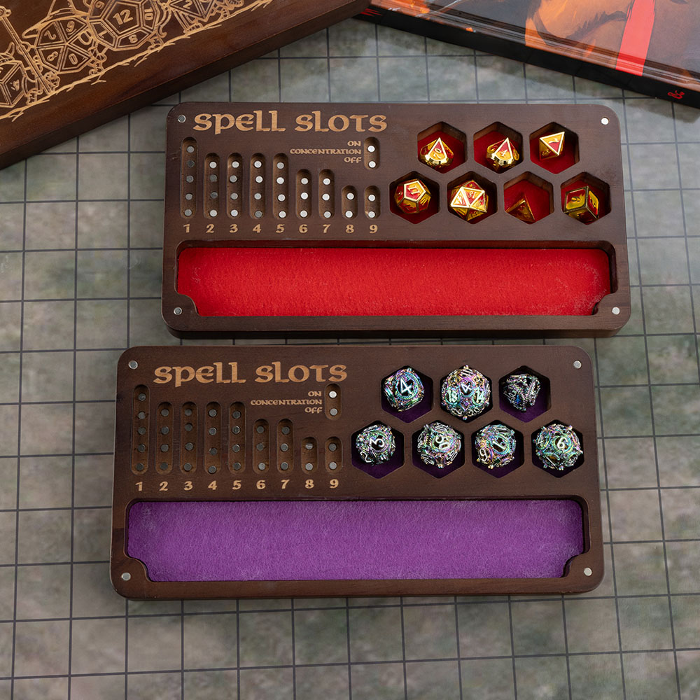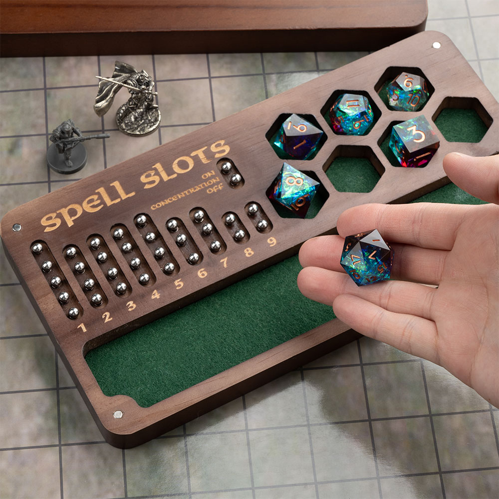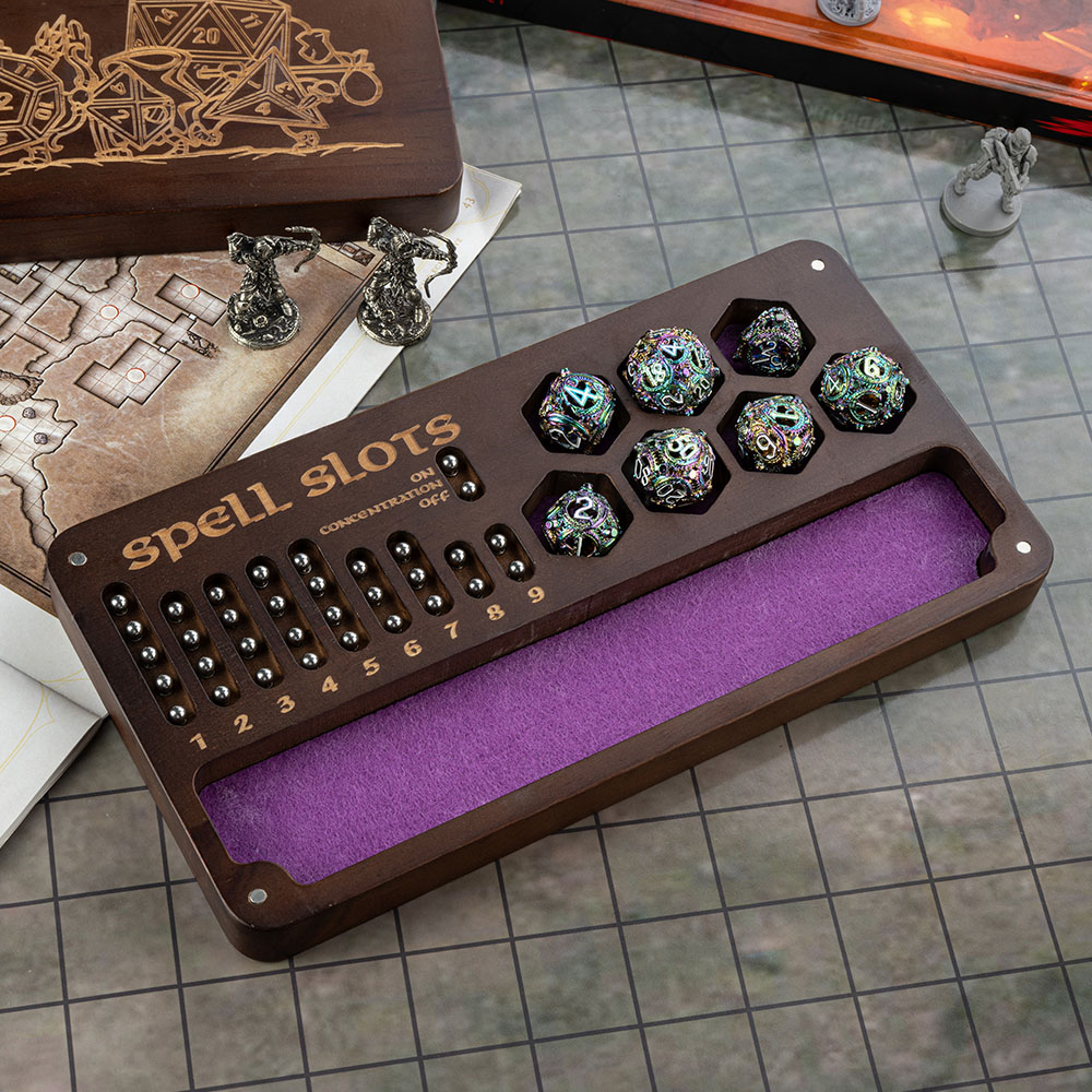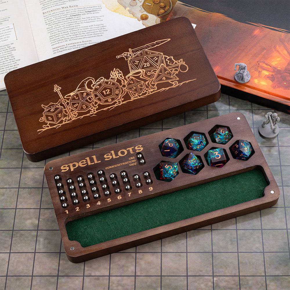 This is a multifunctional product that integrates a dice box, dice tray, and Spell Slot Tracker. High quality wood and exquisite craftsmanship ensure the durability and aesthetics of this product, making this unique dice box the perfect companion for your adventure journey!